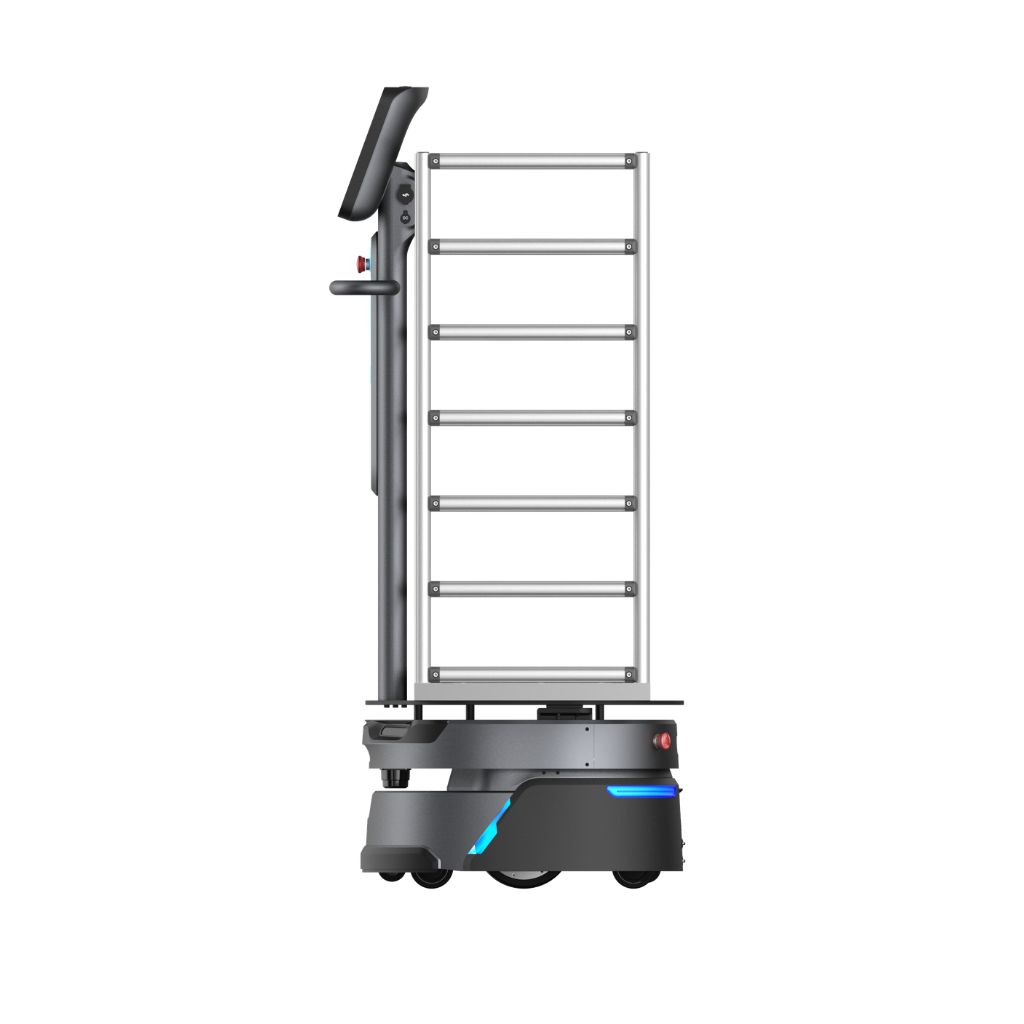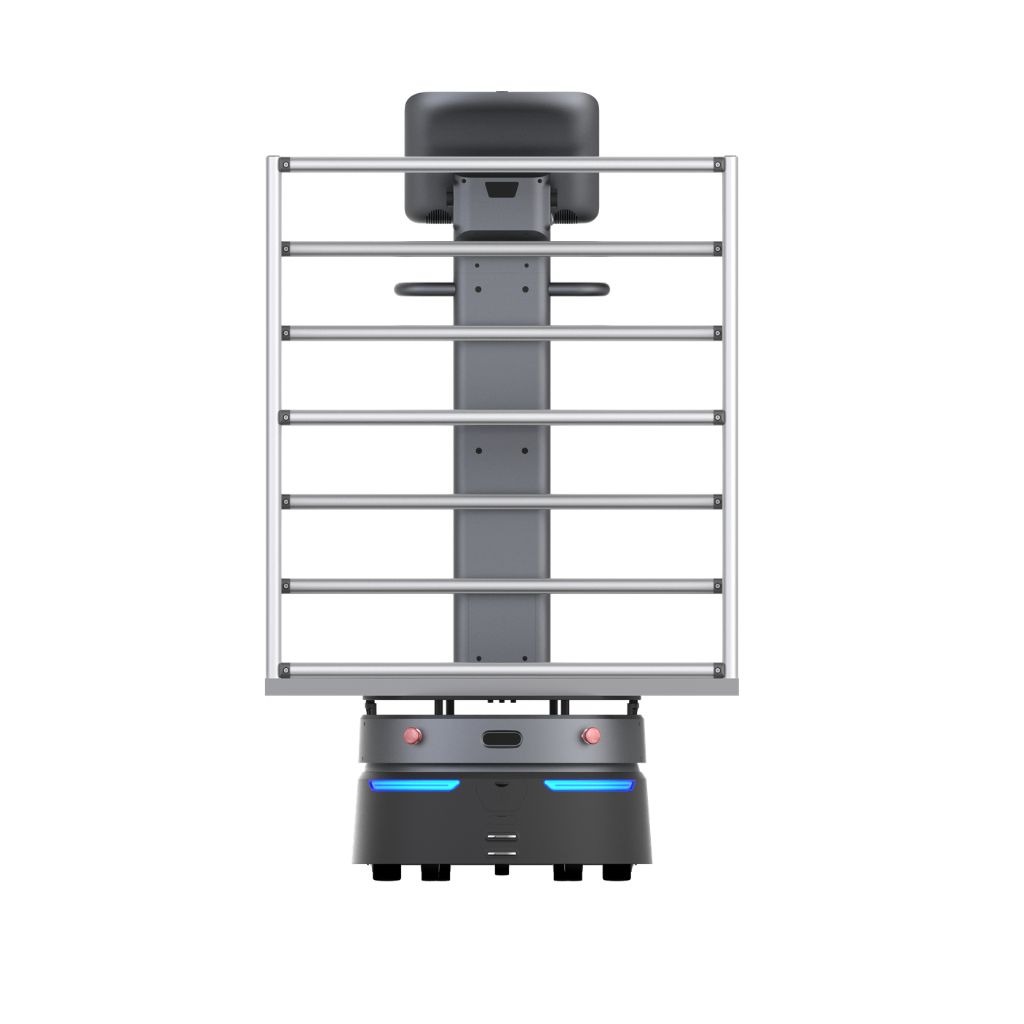 Kệ khung kim loại nhiều tầng – Kích thước 405 × 825 × 937 mm: Thiết kế khung thanh ngang nhiều tầng, thuận tiện xếp nhiều thùng hàng cao tầng cùng lúc. Tổng trọng lượng kệ 12 kg, kết hợp thân robot 48 kg = 60 kg – vẫn đảm bảo tải hữu ích lên 150 kg (bao gồm kệ).